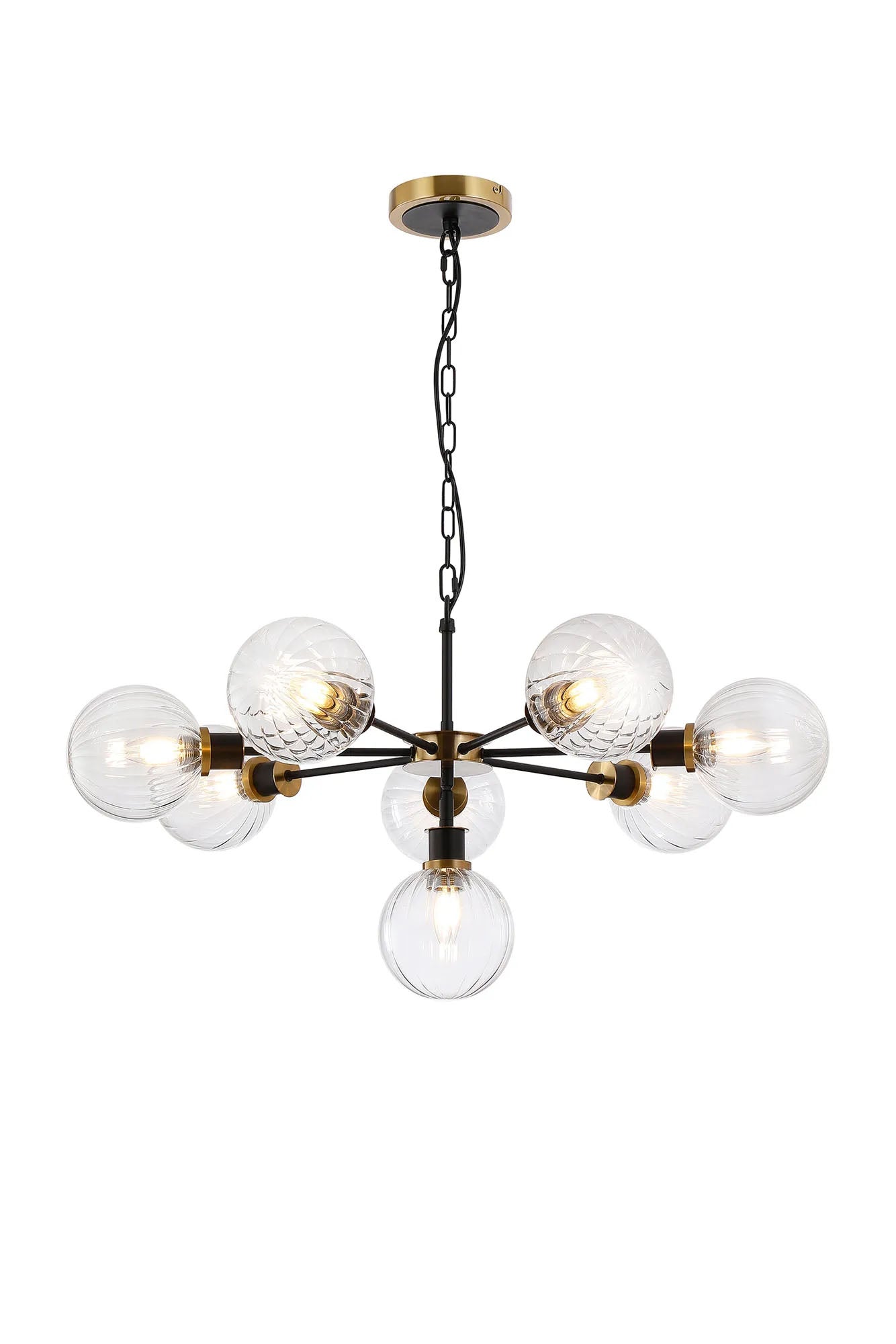 Stevens Pendant, 8 x E14 With 15cm Round Segment Glass Shade, Brass, Clear & Satin Black