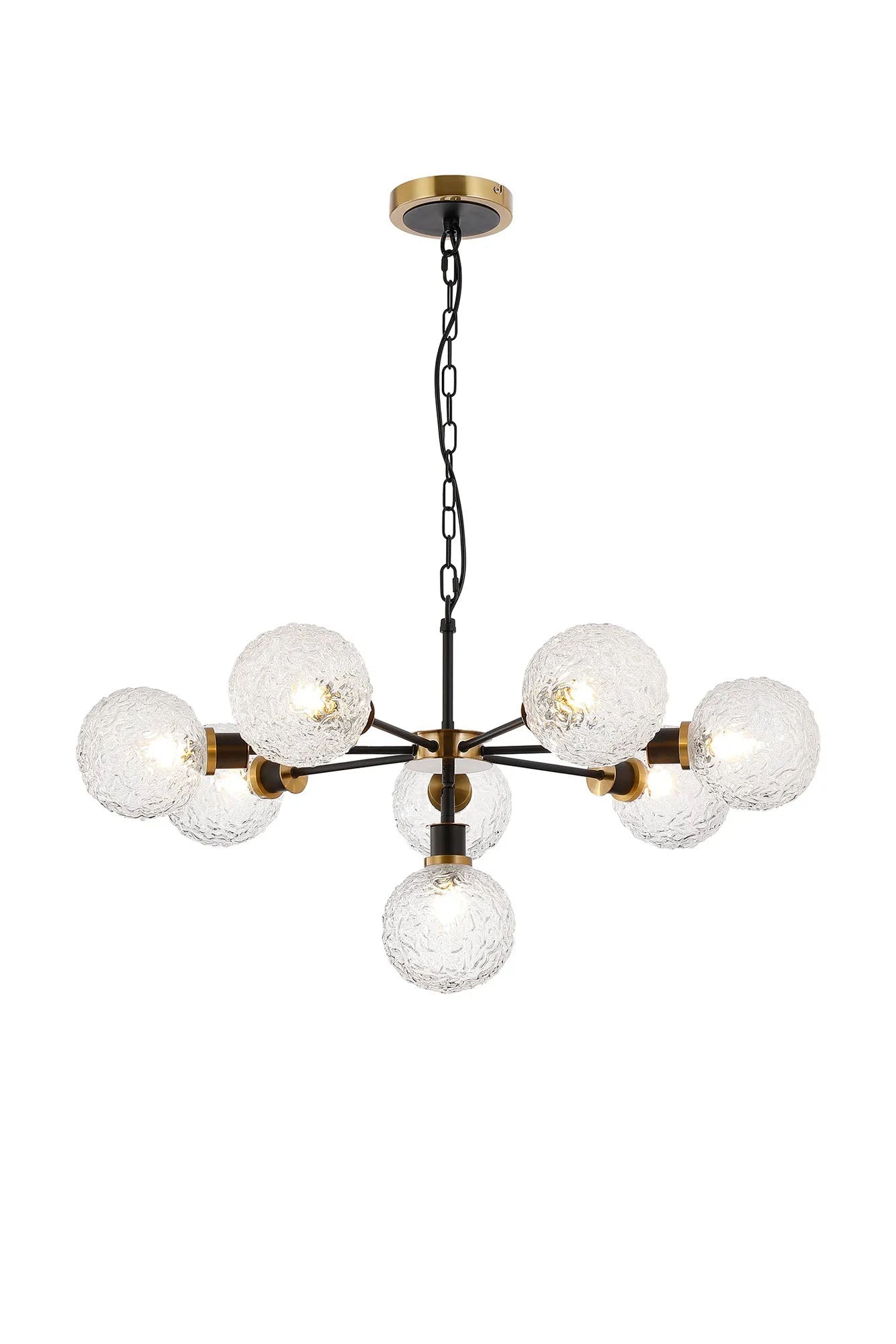 Stevens Pendant, 8 x E14 With 15cm Round Textured Crumple Glass Shade, Brass, Clear & Satin Black