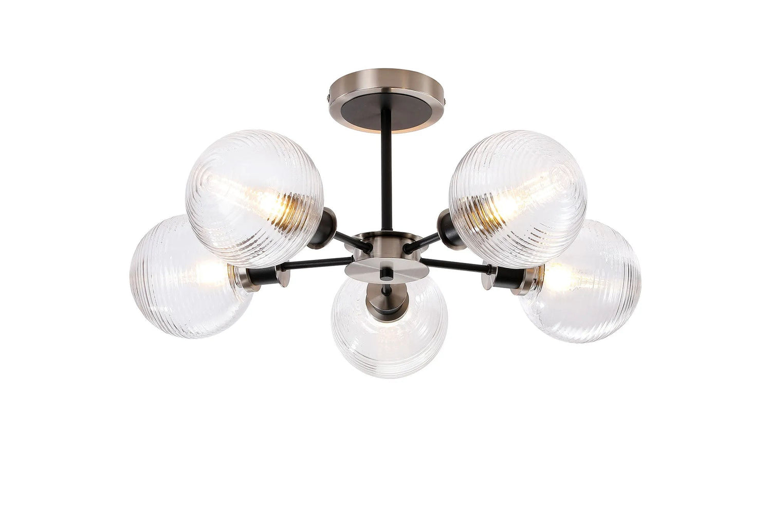 Stevens Semi Ceiling, 5 x E14 With 15cm Round Ribbed Glass Shade, Satin Nickel, Clear & Satin Black