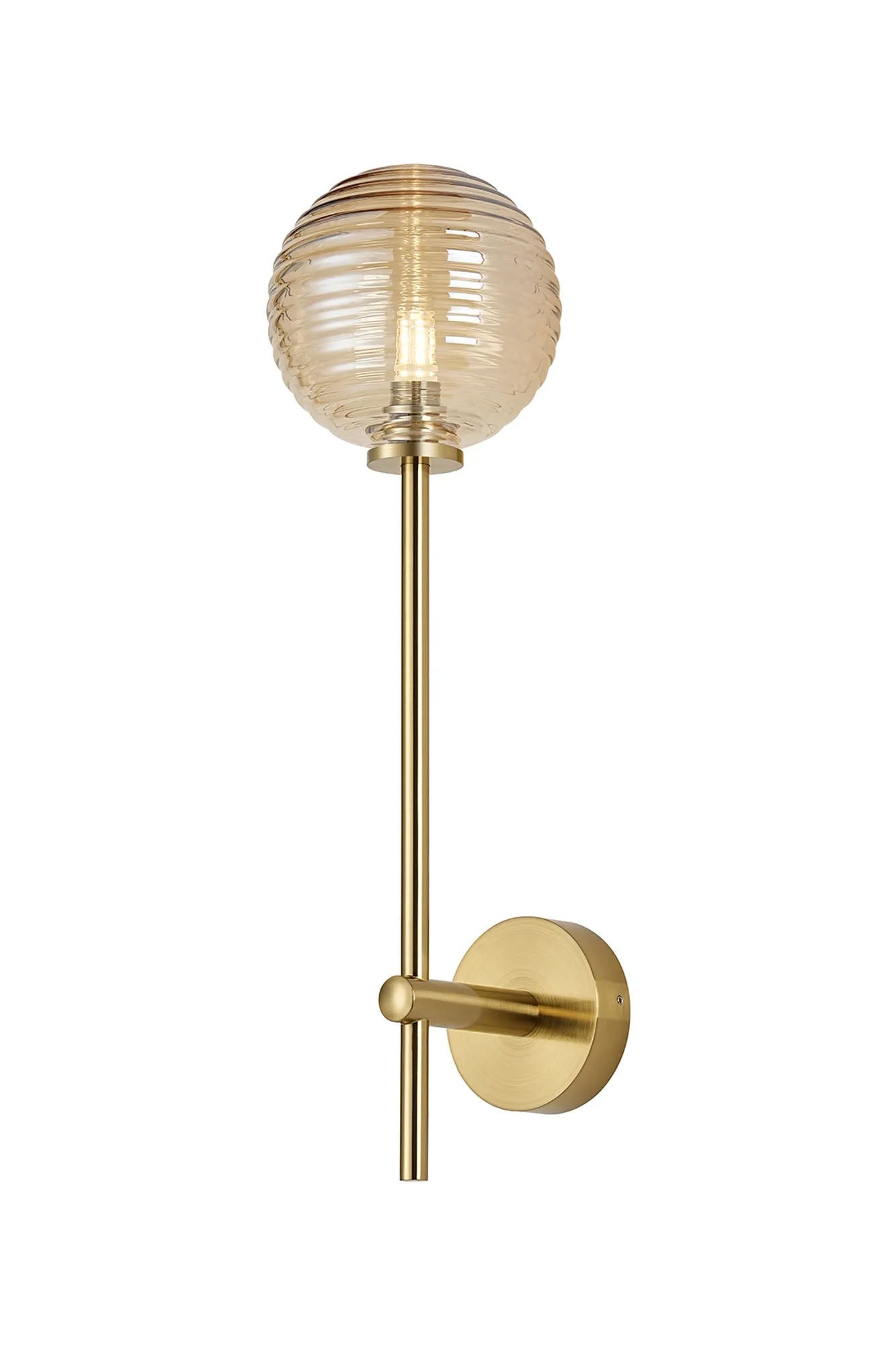 Whitley Tall Arm Wall Lamp 1 Light IP44 Brass Gold/Amber Ribbed Round Glass