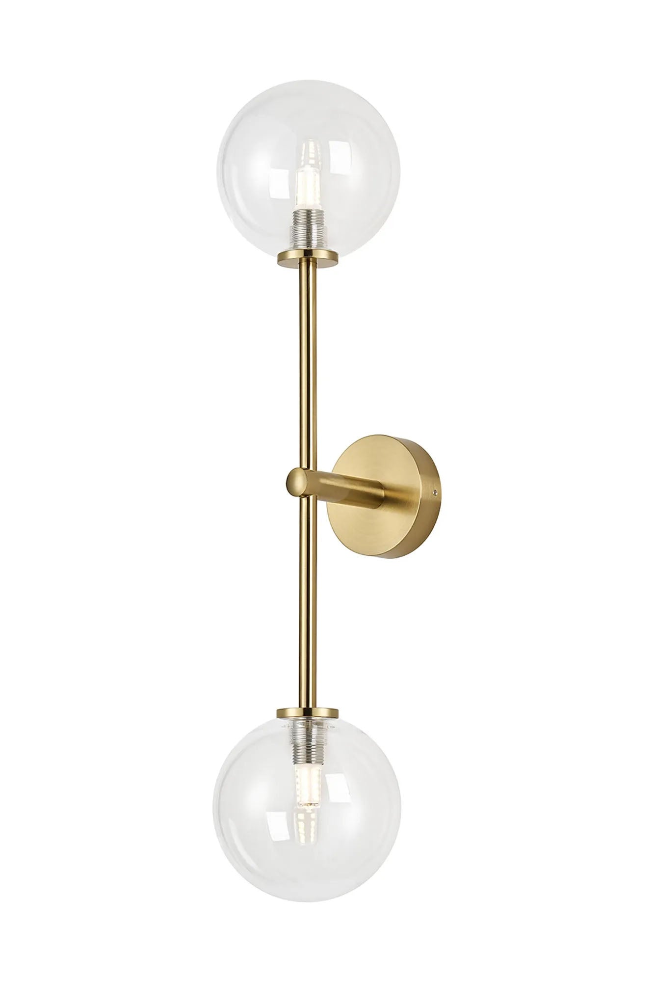 Whitley Tall Arm Wall Lamp 2 Light IP44 Brass Gold/Clear Smooth Round Glass