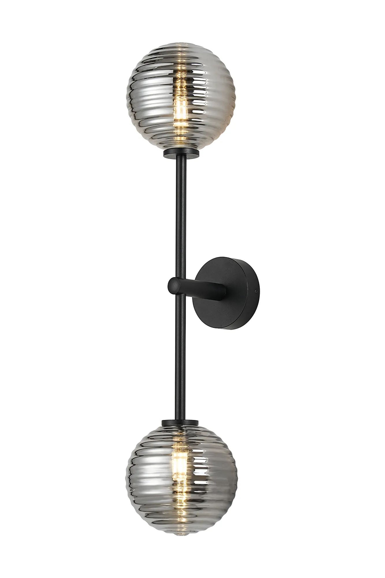 Whitley Tall Arm Wall Lamp 2 Light IP44 Satin Black/Smoke Ribbed Round Glass