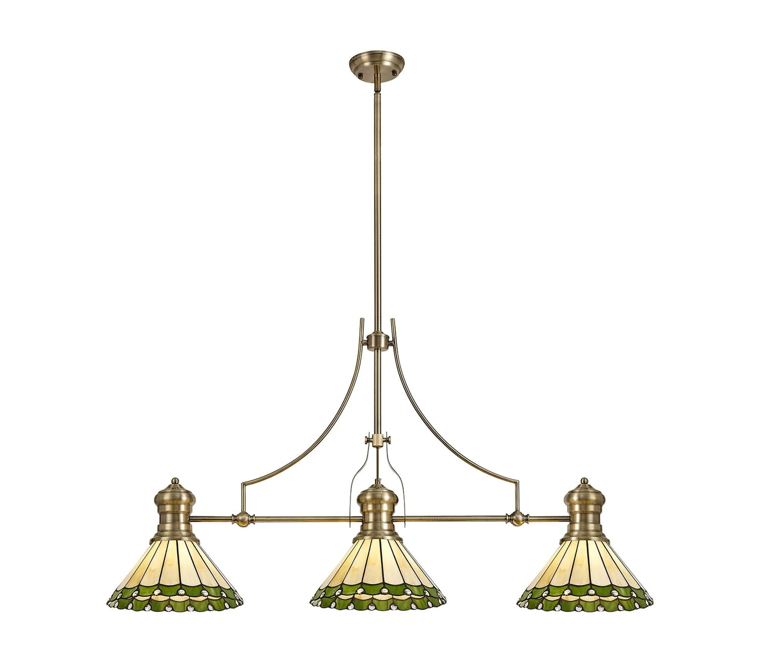 Williams 3 Light Linear Pendant E27 With 30cm Tiffany Shade, Antique Brass, Green, Cream, Crystal