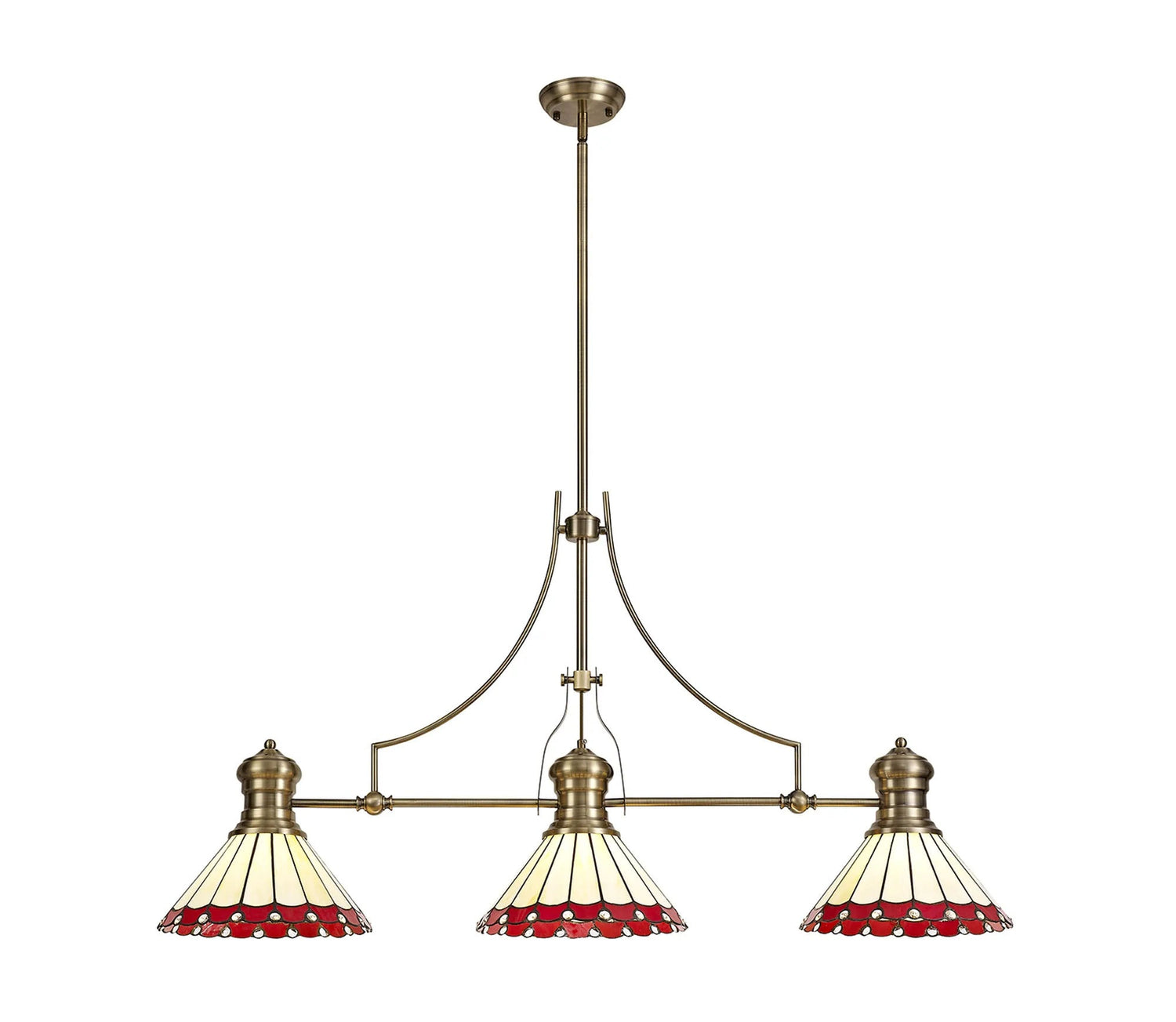 Williams 3 Light Linear Pendant E27 With 30cm Tiffany Shade, Antique Brass, Red, Cream, Crystal