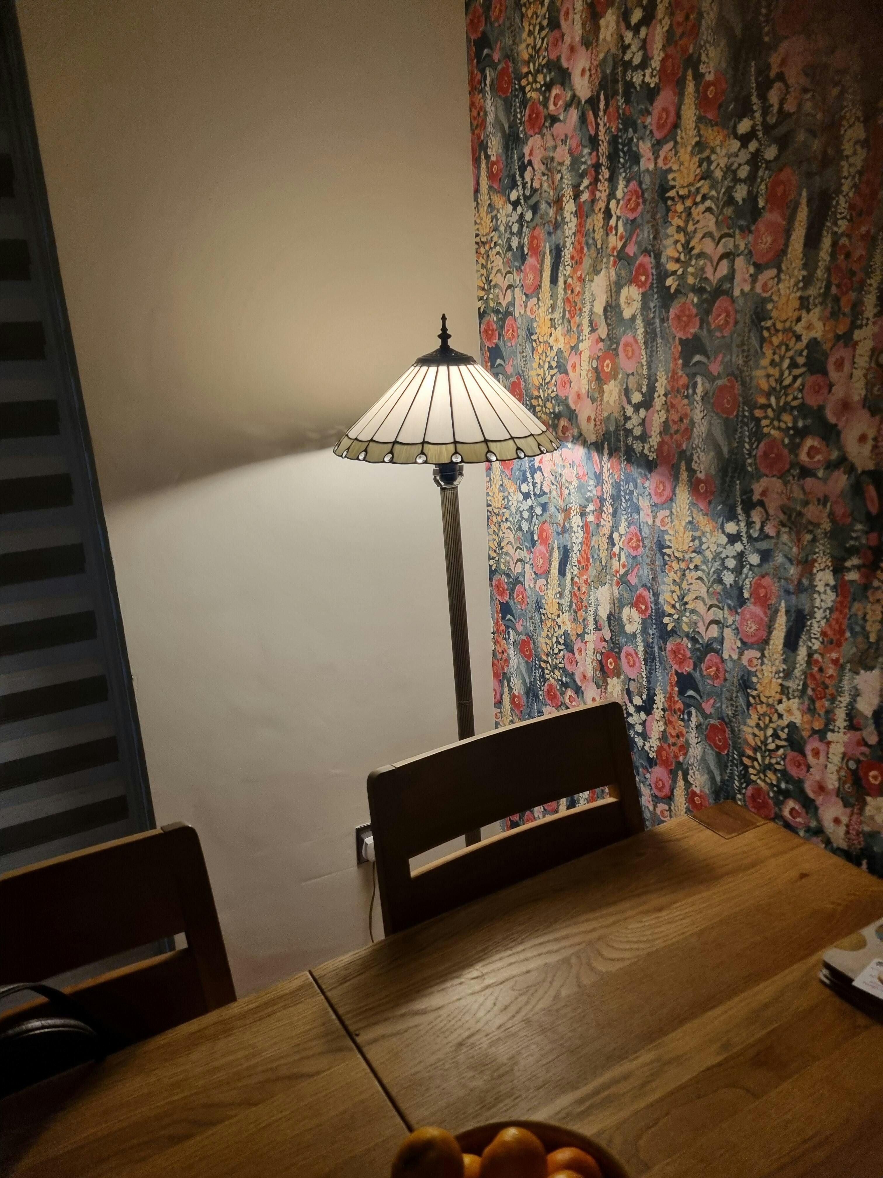 Williams uses a traditional Tiffany shade but with a modern twist. The fanned feather shapes forming the umbrella glass is mostly cream coloured with the curved tips of each point available in either green, brown, red, purple or grey. The modern component takes the form of small clear crystal pieces fixed on alternating points of the shades rim furthering the ranges regal appeal.