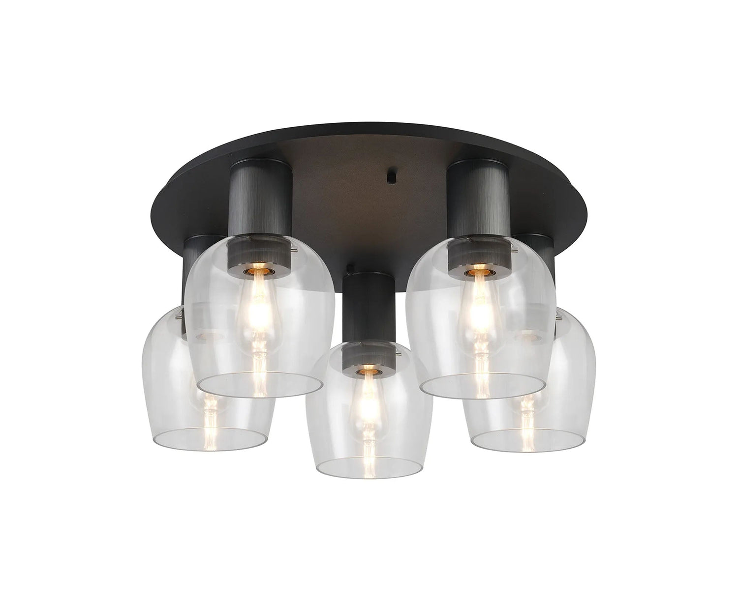 Withe 60cm Round Ceiling Light, 5 x E27, Gun Metal/Satin Black/Clear Wine Glass