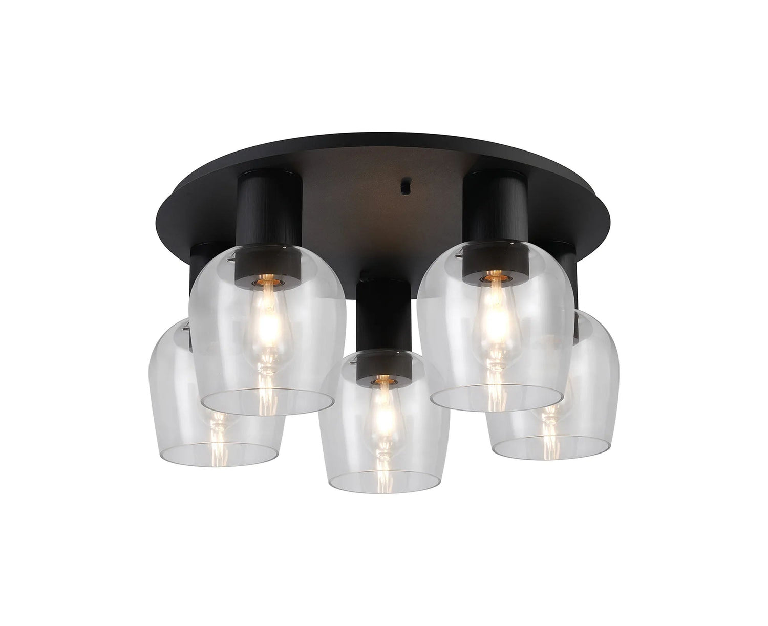 Withe 60cm Round Ceiling Light, 5 x E27, Satin Black/Clear Wine Glass