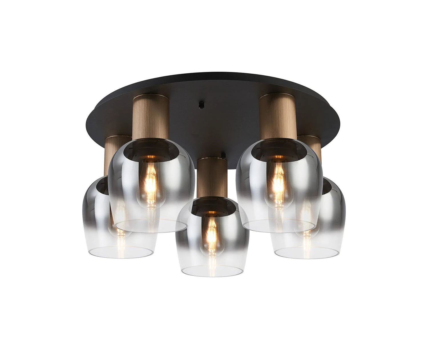 Withe 60cm Round Ceiling Light, 5 x E27, Titanium Gold/Satin Black/Smoke Fade Wine Glass