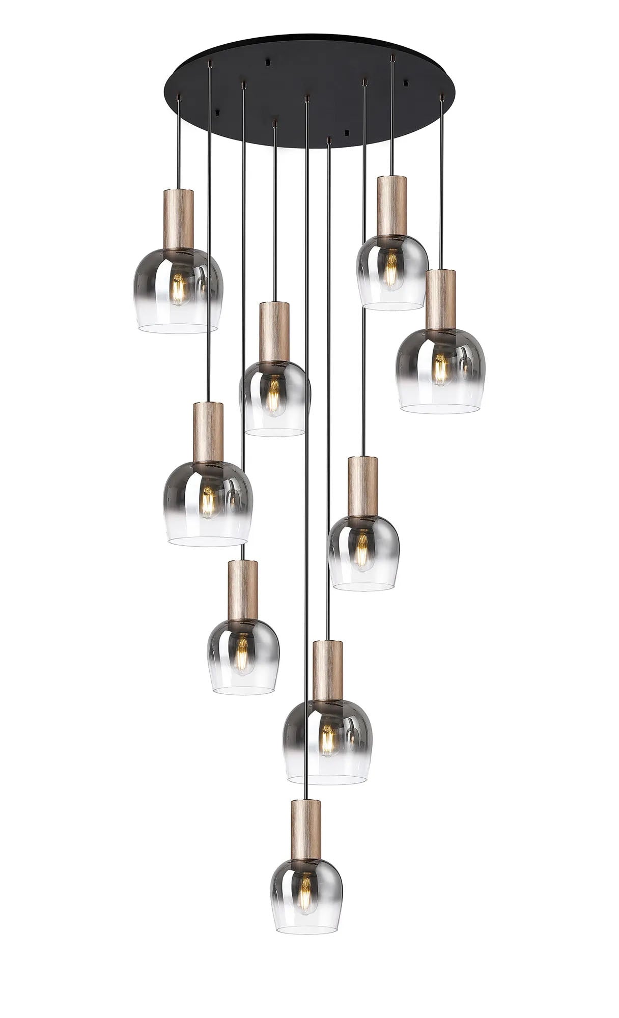 Withe 62.5cm Round Pendant, 9 x E27, Titanium Gold/Satin Black/Smoke Fade Wine Glass Item Weight: 16kg is backordered and will ship as soon as it is back in stock.