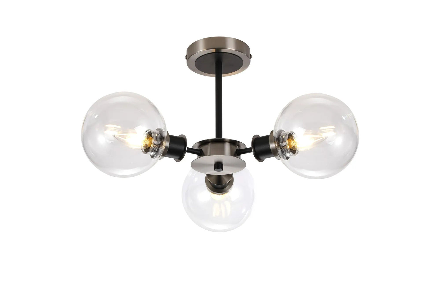 Woods Semi Ceiling, 3 x E14 With 15cm Round Glass Shade, Satin Nickel, Clear & Satin Black is backordered and will ship as soon as it is back in stock.