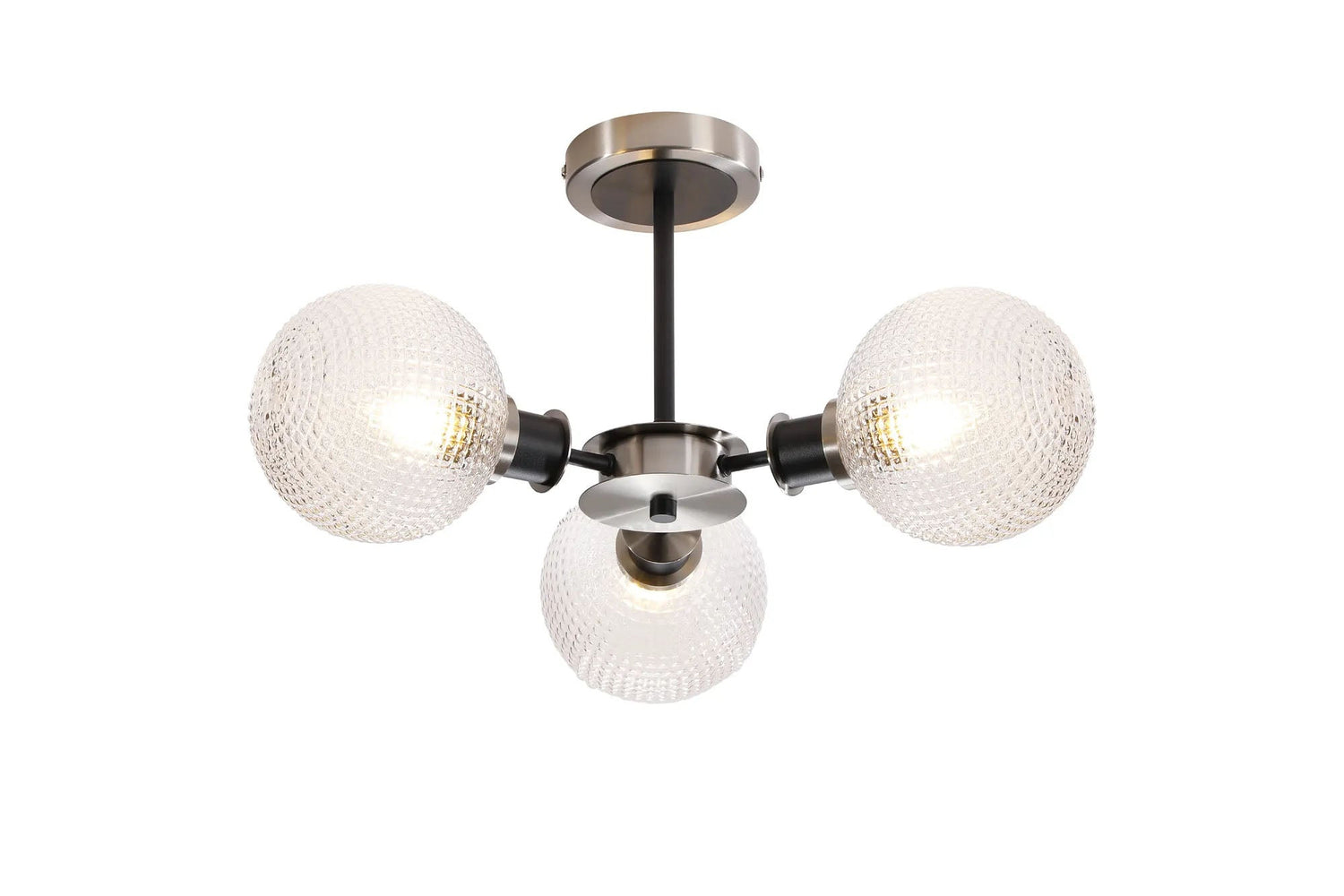 Woods Semi Ceiling, 3 x E14 With 15cm Round Textured Diamond Pattern Glass Shade, Satin Nickel, Clear & Satin Black