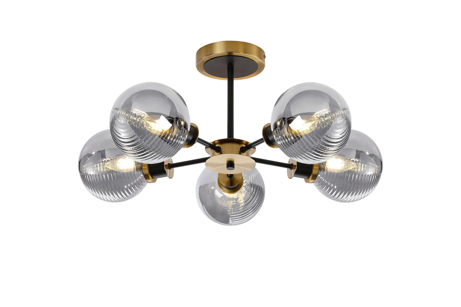 Woods Semi Ceiling, 5 x E14 With 15cm Round Double Textured Smooth/Ribbed Glass Shade, Brass, Smoke Plated & Satin Black