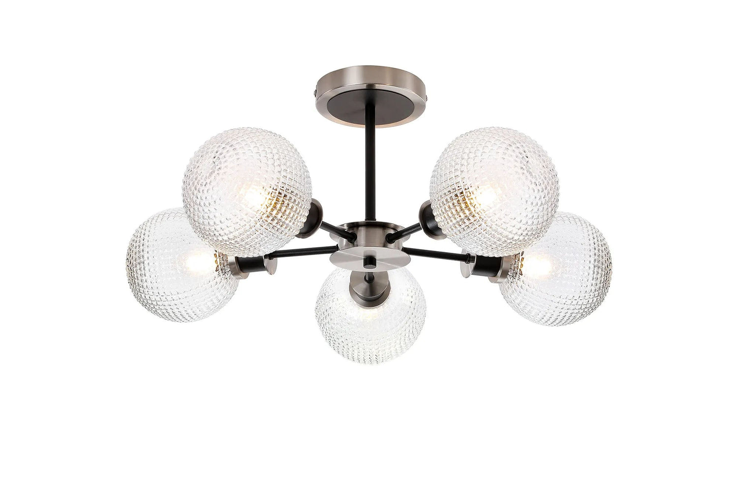 Woods Semi Ceiling, 5 x E14 With 15cm Round Textured Diamond Pattern Glass Shade, Satin Nickel, Clear & Satin Black